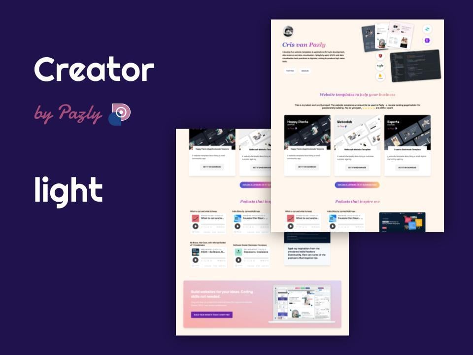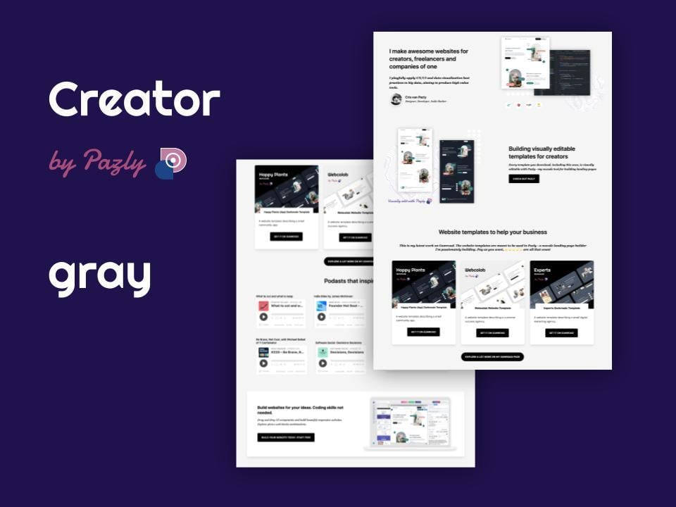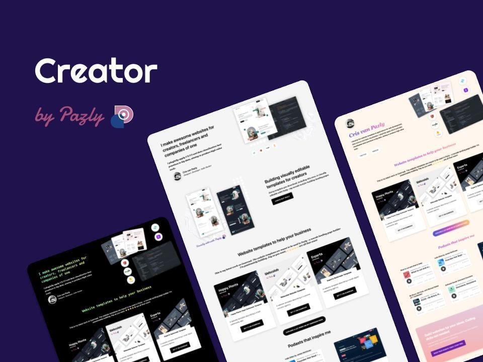 3 website templates describing a creator profile. Every template a landing page packed with the essential components to make a website clear and attractive to every user. Customize these templates with Pazly Pro https://pazly.dev